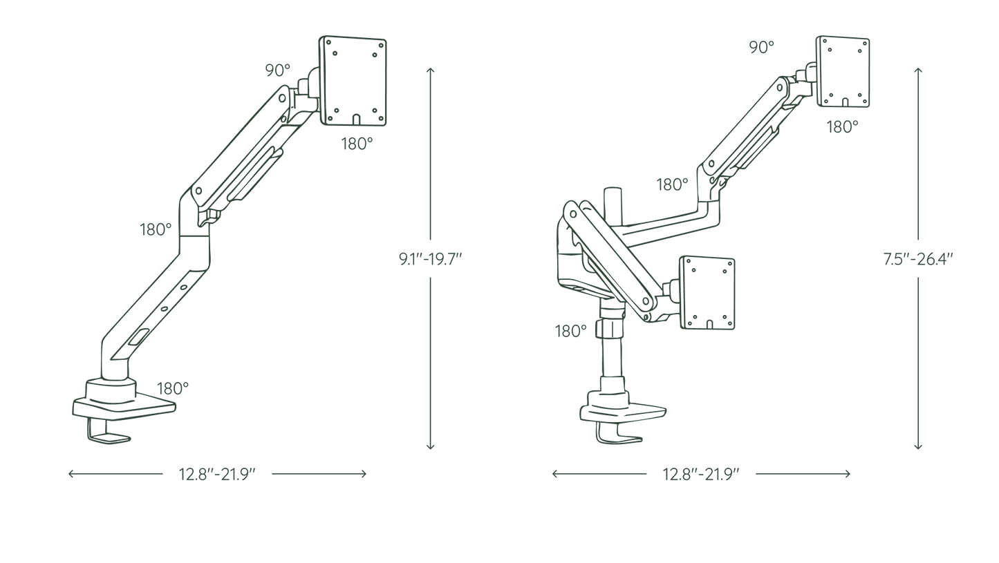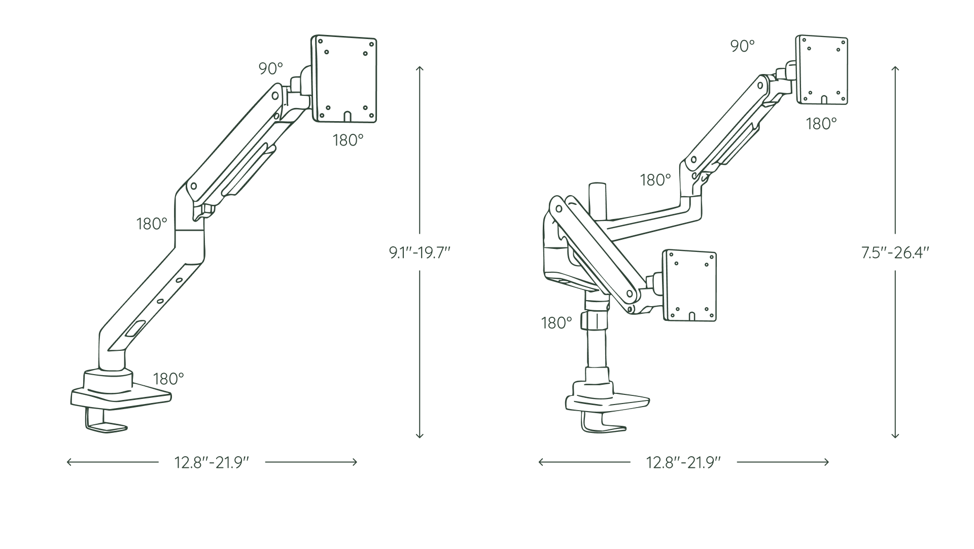 The Monitor Arm’s smooth swivel, tilt, and full rotation make it easy to find your ideal screen position, whether you prefer to sit, stand, or shift throughout the day. Available in single or double-arm configurations, the Monitor Arm installs easily with a secure clamp or grommet mount and is compatible with all Branch desks. Pair it with the Laptop Mount to position your laptop beside your monitor screen.