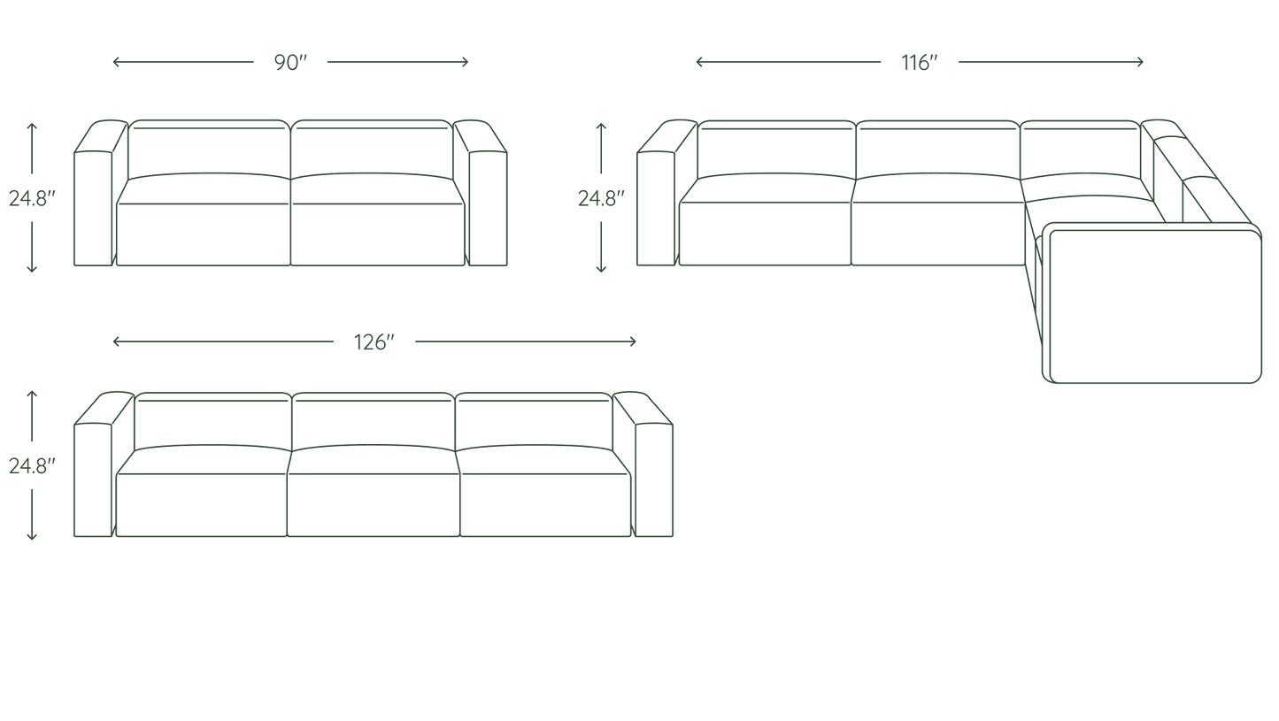 General Dimensions2-Seater: 90"W x 34.5"D x 24.8"H | 3-Seater: 126"W x 34.5"D x 24.8"H | Sectional: 116"W x 116"D x 24.8"H