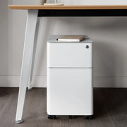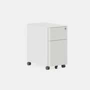 Introducing the Small Filing Cabinet: a space-saving and subtle addition to any home or office. Its streamlined design features an integrated lock and smooth-rolling wheels, making it both practical and stylish. The cabinet includes drawer dividers to ensure your items stay organized, as well as locking drawers for added security. Its compact size accommodates standard hanging folders lengthwise, and the cabinet is constructed from durable coated steel that resists dirt and fingerprints.